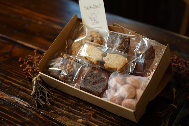 おまかせ 焼き菓子セット クッキーを中心とした 全7種をつめた焼き菓子セットです。 【原材料】 各お菓子裏に成分表示記載をして発送します。 【賞味期限】 マドレーヌ、ケーキ類などは発送日より約5日程度。冷暗所で保存してください。 クッキー類は発送日より約2週間。直射日光、高温多湿を避けて保存してください。 すべて保存料など無添加でお作りしております。 到着後はお早めにお召し上がり下さいませ。 【送料について】 3セットめからのご注文は80サイズをお選びください。 ※2セットまでは60サイズで可能。2セット+単品販売をお選びのかたは80サイズをお選びください。 宅急便、クール便どちらでもお選び頂けますが 遠方、またはお受け取りにお時間のかかる方はクール便をお選びください。 (東京都、または神奈川県内から発送します) *夏季はクール便のみの発送となります。